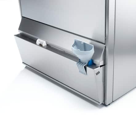 Tank dishwasher with short cycles for fast turnaround times - incl. integr. cleaning agent containers.