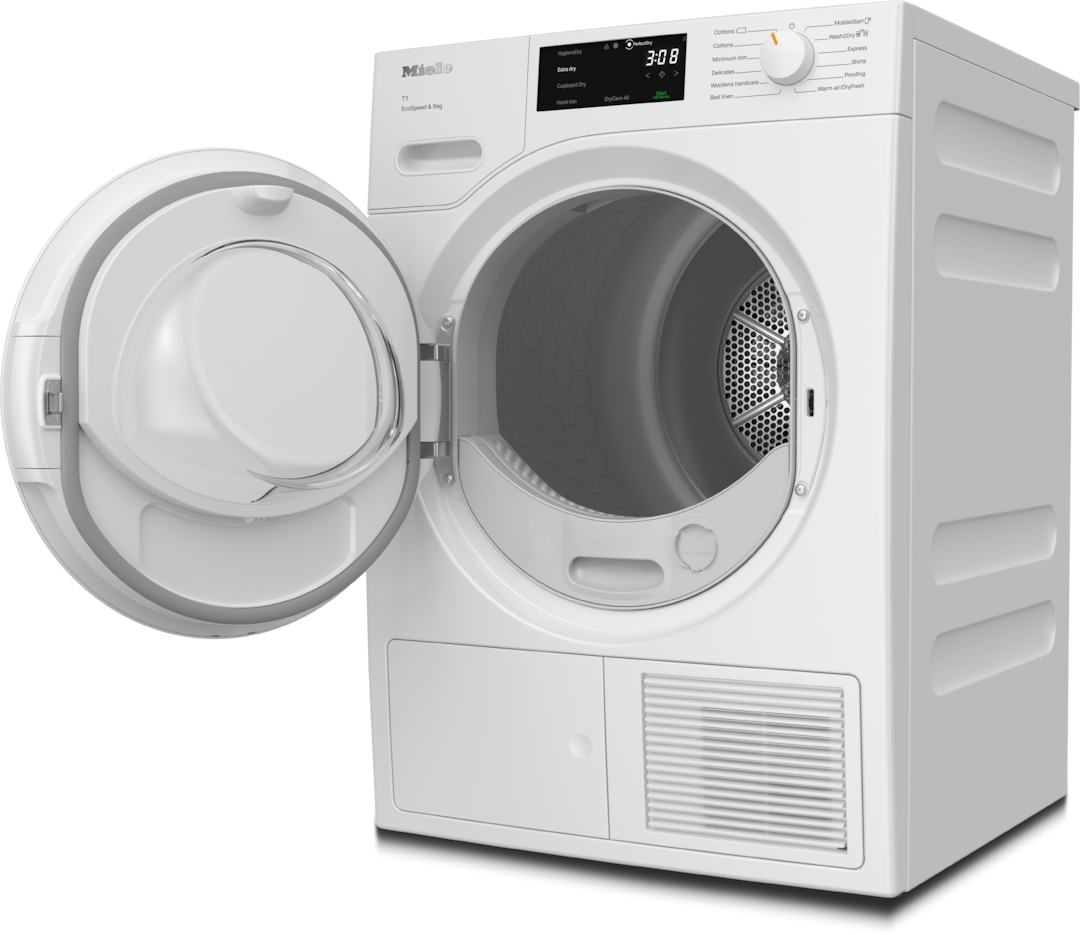 - 8.Time savings calculated compared to Miele tumble dryers without EcoSpeed with the same load size and similar energy efficiency. Tested in the “Cottons” programme with a full load size.